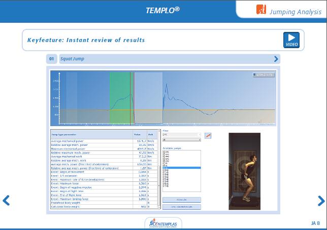 特点: * 集成1-2台高速摄像机,1块或2块测力台 * 实时在线反馈的测试/训练系统 * 适用于深蹲跳、纵跳、跳深、踏跳和单足跳的动作分析 * 报告综合全面,包括跳跃的参数和图表 * 同步可视化的跳跃阶段图形显示 * 显示每块测力台的力矢量/合力 * 数据库管理模式