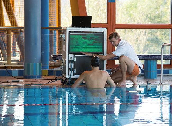 台车工作站搭载了电脑和防水摄像机,可在游泳边移动记录