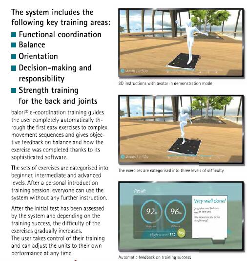 特点: * 集成了压力分布测量平板、摄像机和虚拟现实训练软件 * 符合日常生活活动的特点,提高神经肌肉系统的反应速度 * 防跌倒的平衡训练,提高老年人对环境的适应性 * 核心力量训练,让您的腰背部更健康 * 软件界面直观,有客观的训练参数 * 通过虚拟的动画形象,实现简单的虚拟三维教学 * 平板有两种规格: 115 x 60 cm(1456个传感器)、122 x 90 cm(2240个传感器)