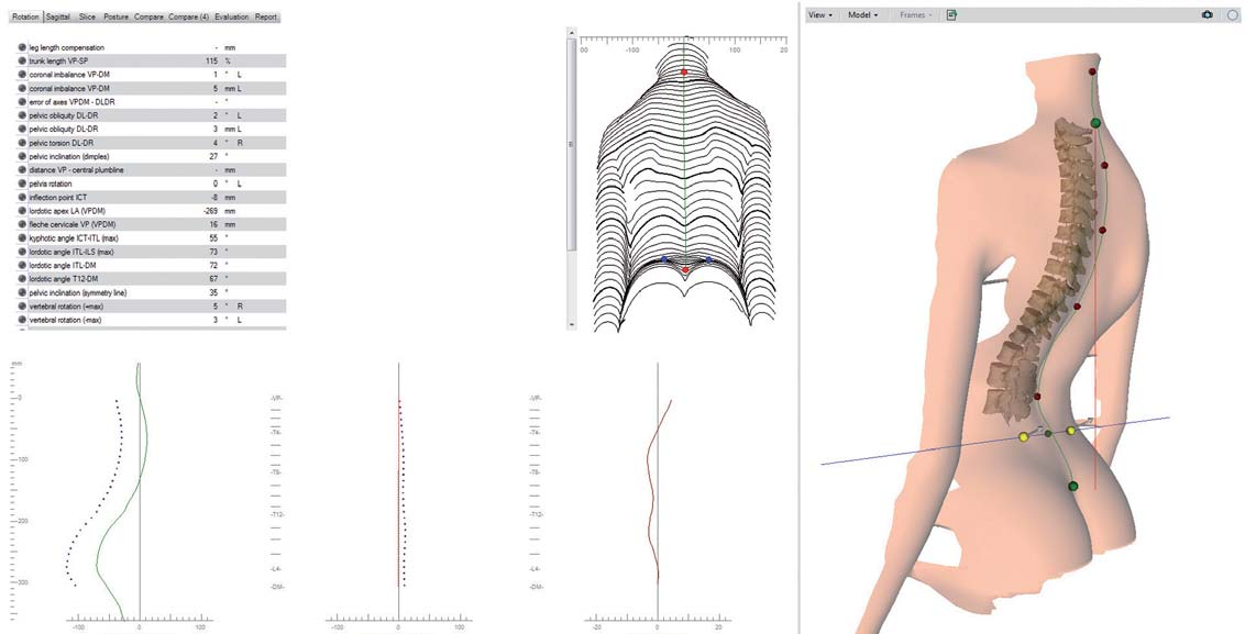 * 提供与姿态、脊柱和骨盆有关的全面信息,如脊柱曲率(侧向/前后)、椎骨旋转、骨盆位置