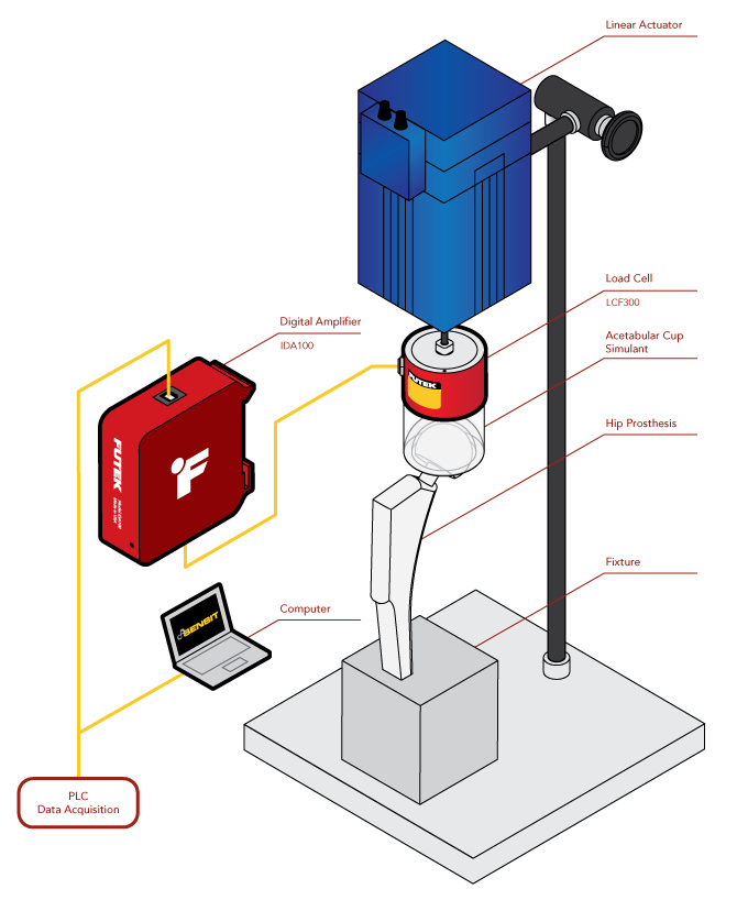 髋关节假肢,跟大多数假肢一样,不是一种尺寸就能适合所有人。先进的3D打印技术,如直接激光金属烧结(DLMS)可以降低成本、客户化定制、金属植入。可靠性、耐久性和耐疲劳性对植入患者的生存能力至关重要。疲劳和力量测试必须符合ISO 7206 - 4,6和pi- 58(ISO7206 - 8)和ASTM F 2580的髋关节植入测试规范。通过配合使用测力传感器及带显示和模拟输出的放大器,就可以轻松地实现测试的自动化并记录所需数据。